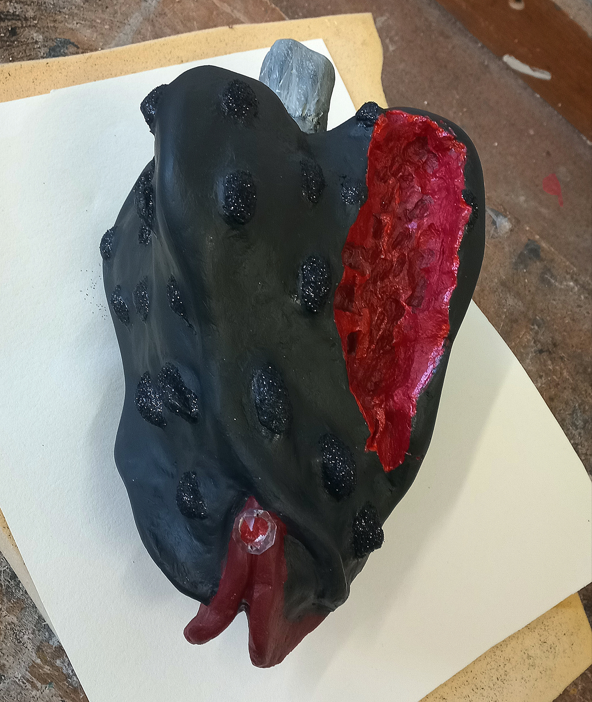 Femi-Fruit-Zutaten: Alabastergips, Moltofill, rote und schwarze Acrylfarbe, schwarzer Glitzer, Glasstein, Glaskleber