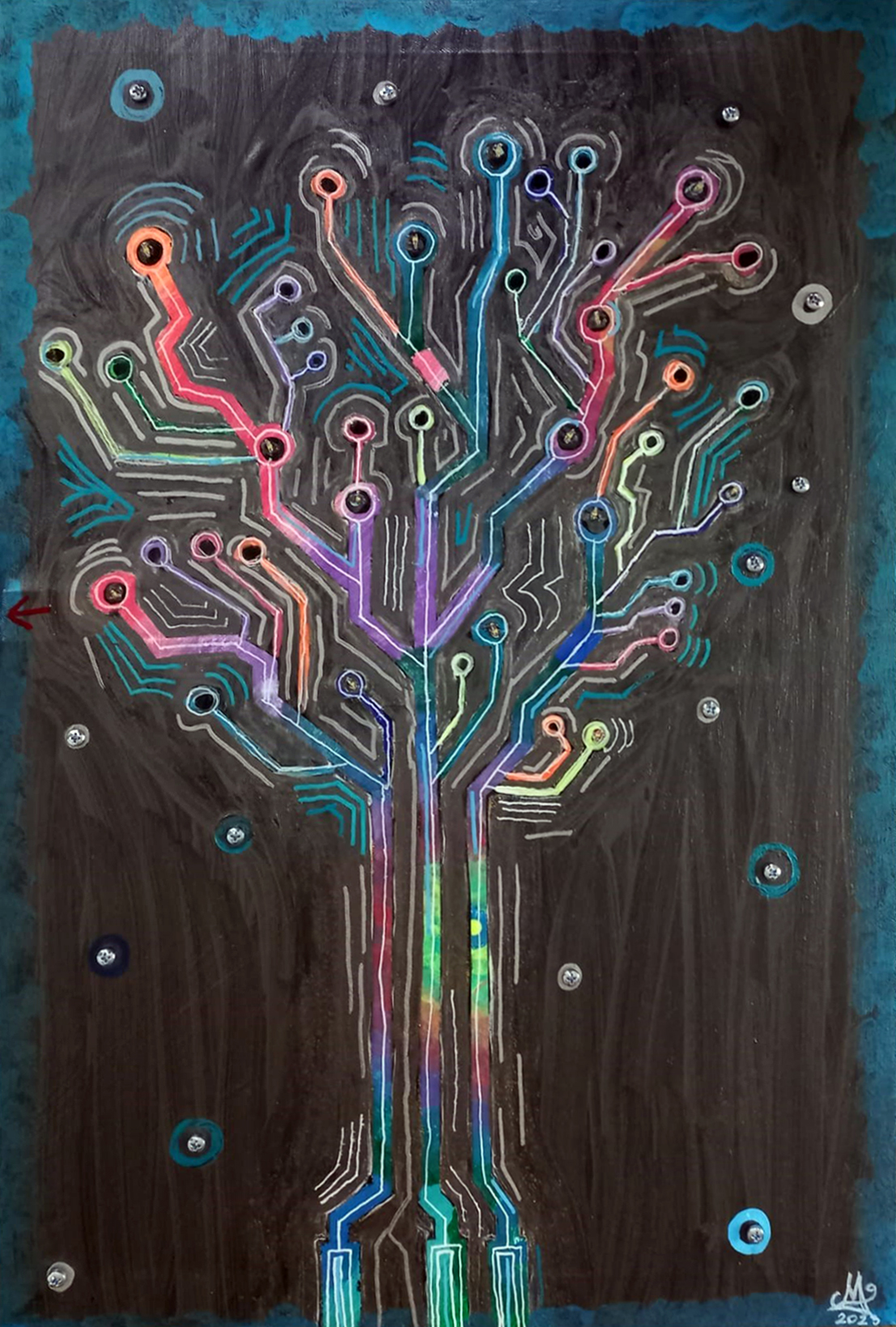 Acryl, Schrauben und LED-Lichterkette auf Leinwand