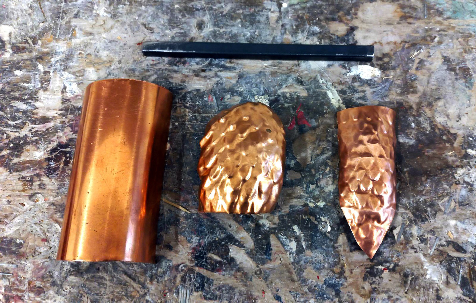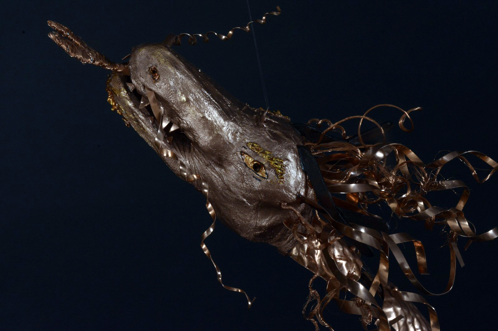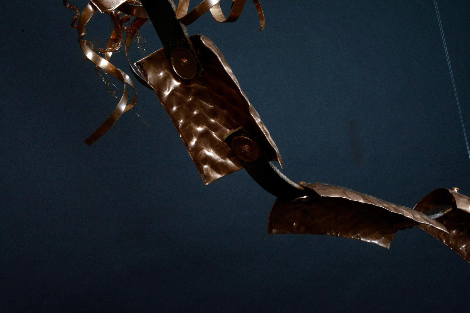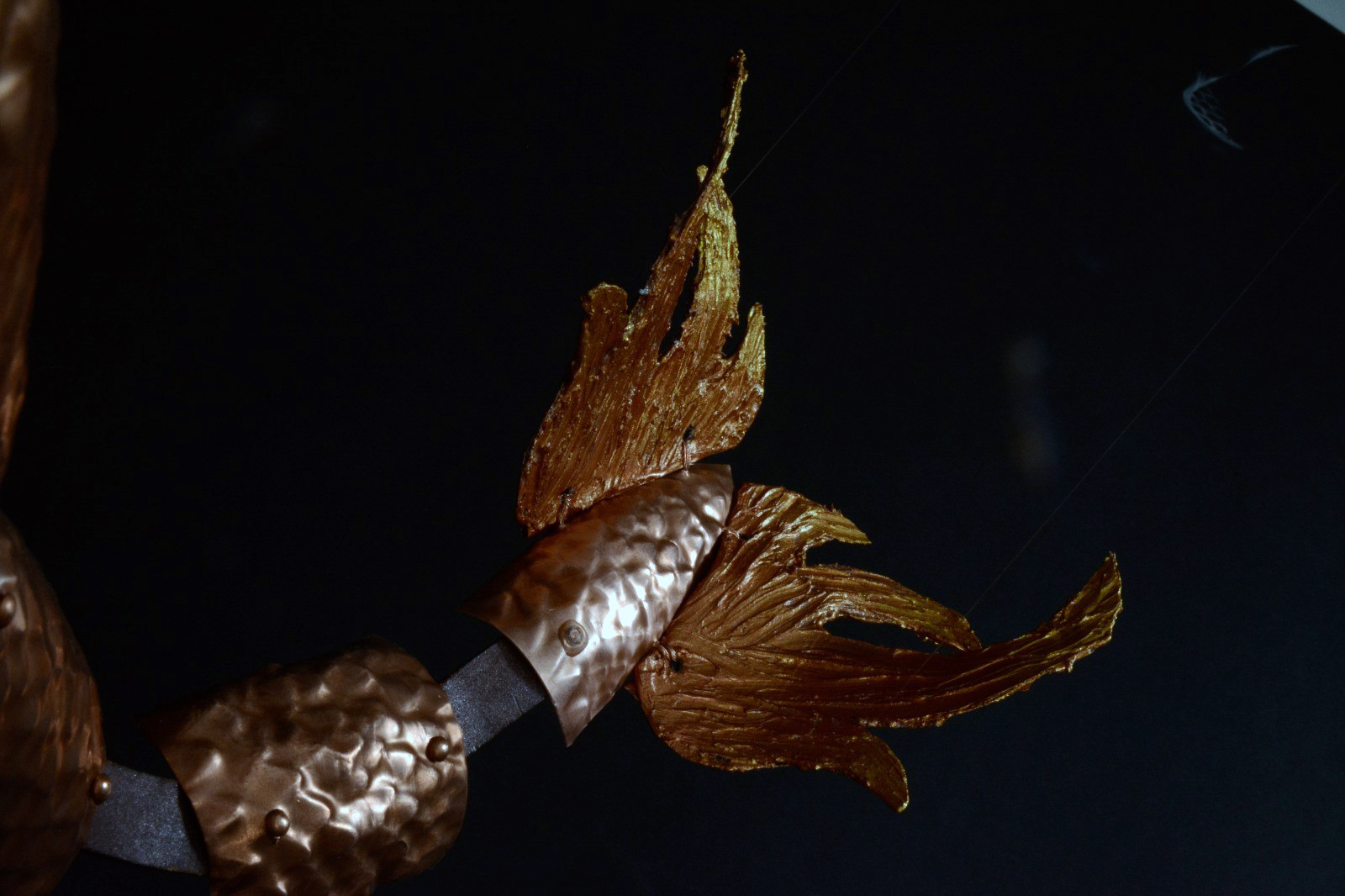 Drachen-Zutaten: Kupfer, Nylonstoff, Montage-Kleber, Styropor, Kupferdrähte, Naturpapier, Metallic-Acrylfarben, Nylonfäden, geschliffene Glaskristalle, Lederband, Kupfernieten